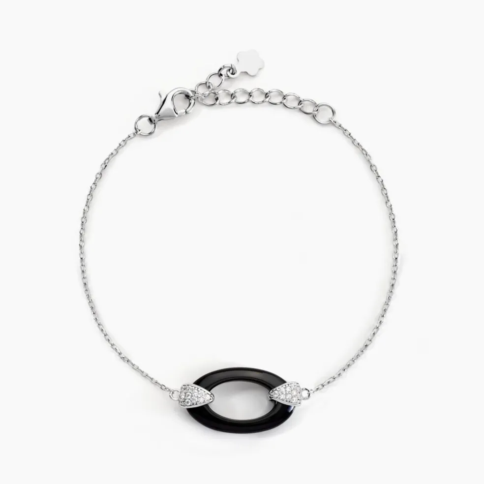 Bracelet Argent Blanc 925/1000 Céramique Noire Ovale Pavage Oxydes De Zirconium Maille Forcat 15.5+3cm
