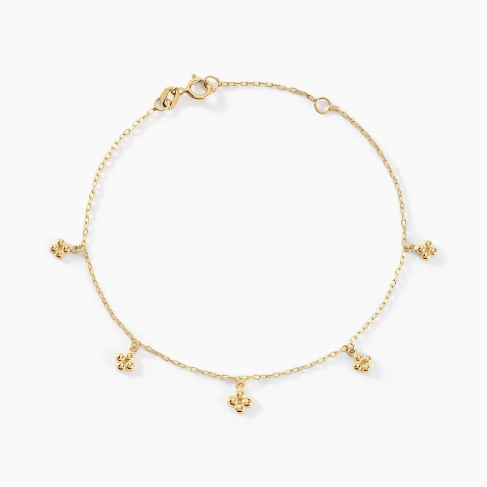 Bracelet Or Jaune 375/1000 5 Pampilles Fleurs Boules Maille Jaseron 16+2cm