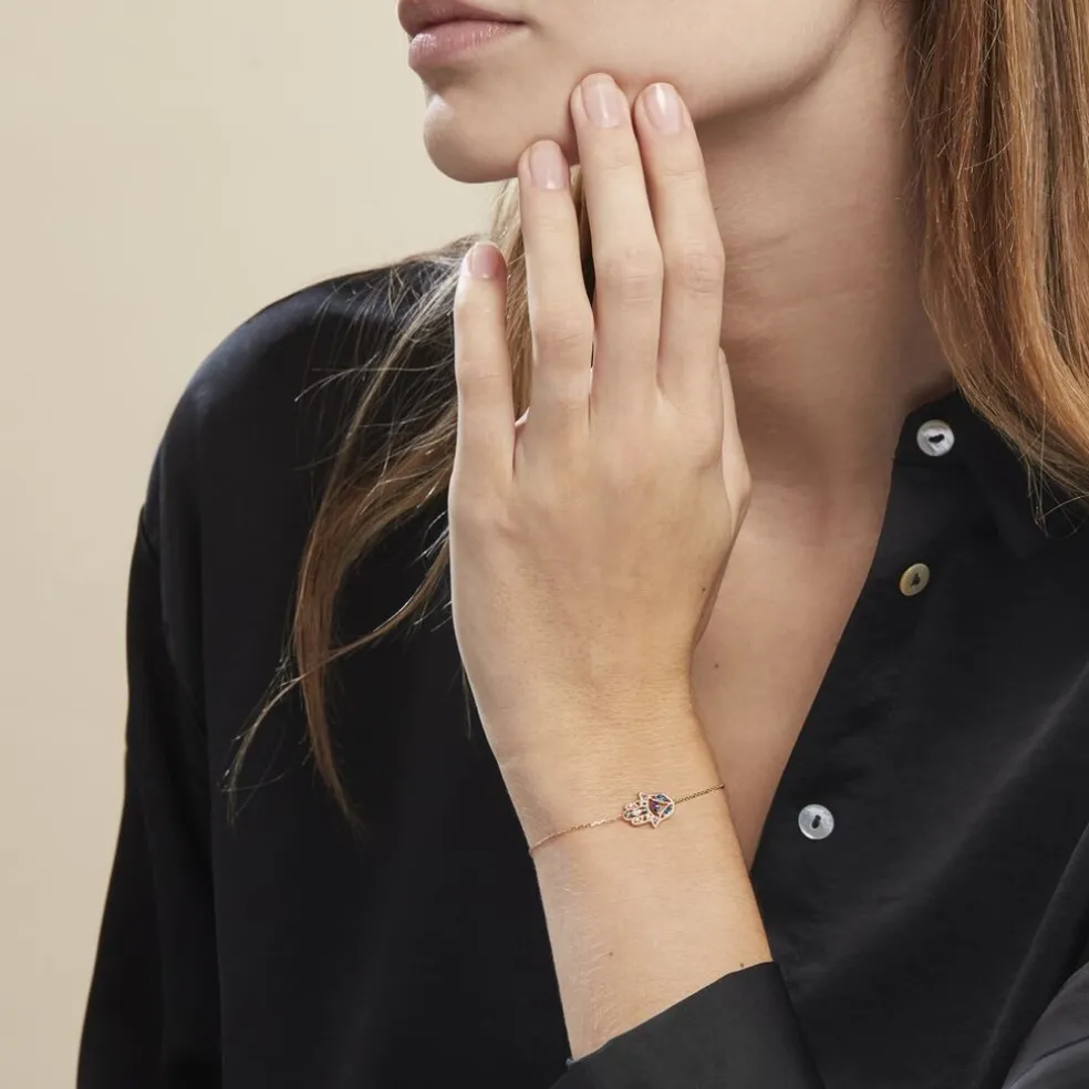 Bracelet Plaqué Or Jaune Main De Fatma Oxydes De Zirconium Colorés Maille Forçat 19cm