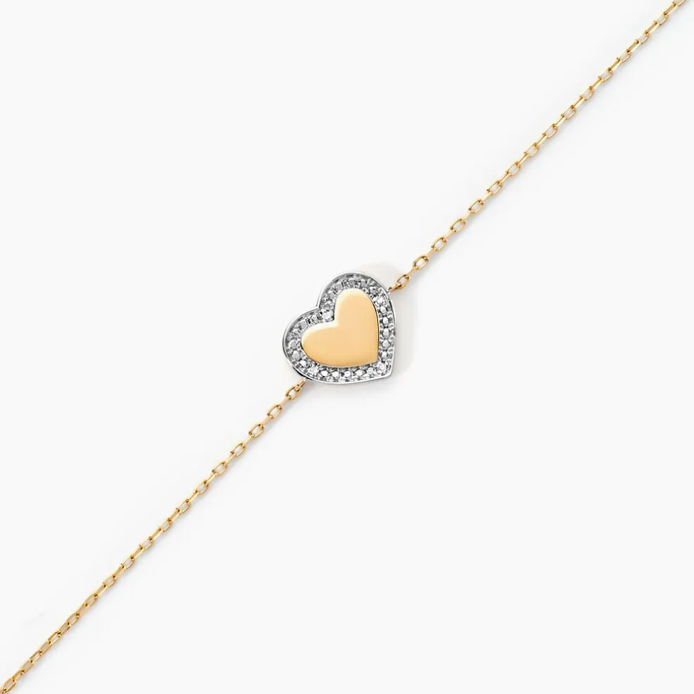 Bracelet Or Jaune 375/1000 Coeur Gravable Diamants 0.009cts Illusion Maille Forcat 16+2cm