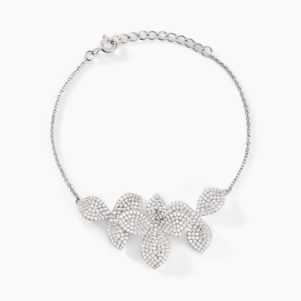 Bracelet Argent Blanc 925/1000 3 Fleurs Pavage Oxydes De Zirconium Maille Forçat 16+3cm