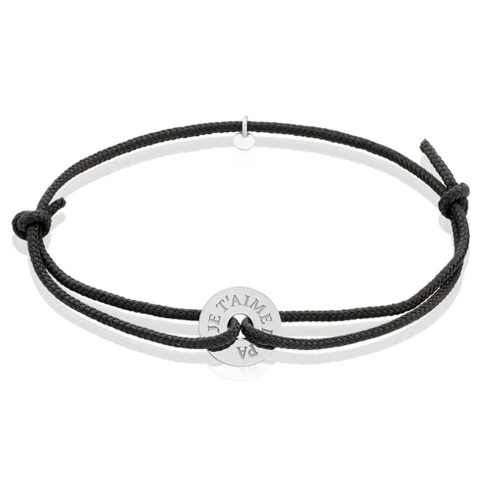 Bracelet Argent Blanc 925/1000 Cercle Gravé Je T’aime Papa Cordon Noir 19cm