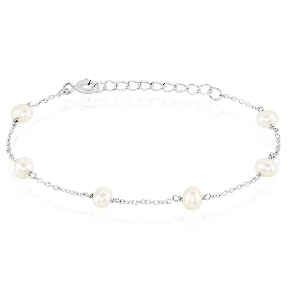 Bracelet Argent Blanc 925/1000 Perles De Culture 4-4.5 Mm Maille Forçat 18.5cm