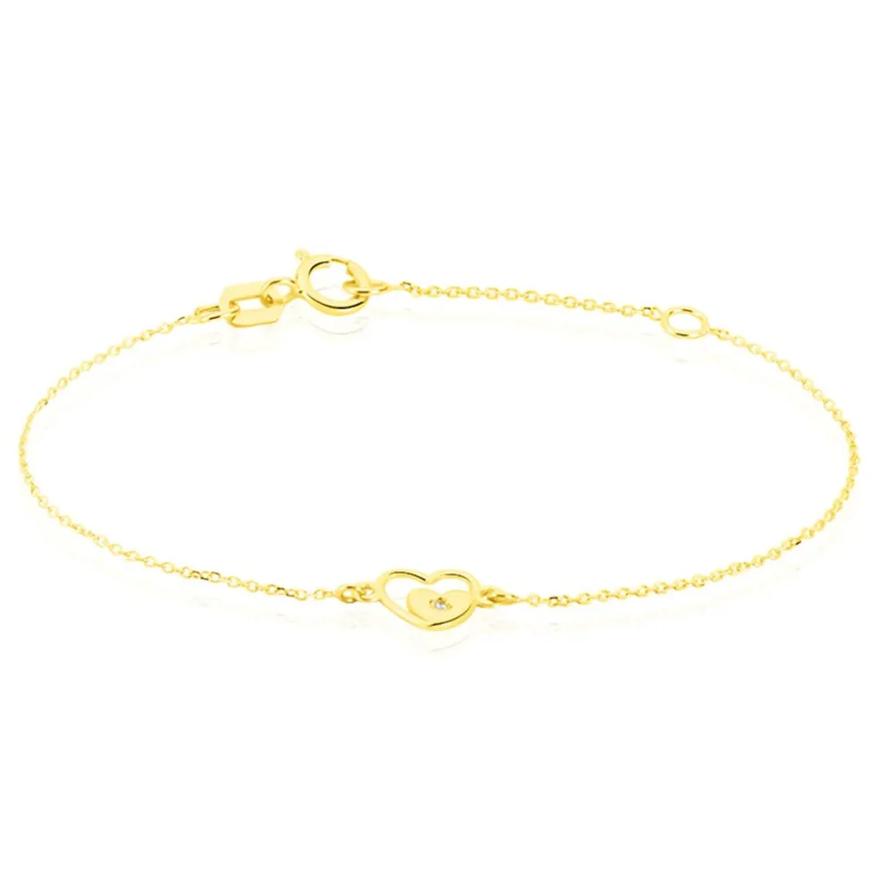 Bracelet Or Jaune 375/1000 Coeur Et Oxyde Maille Jaseron 14cm