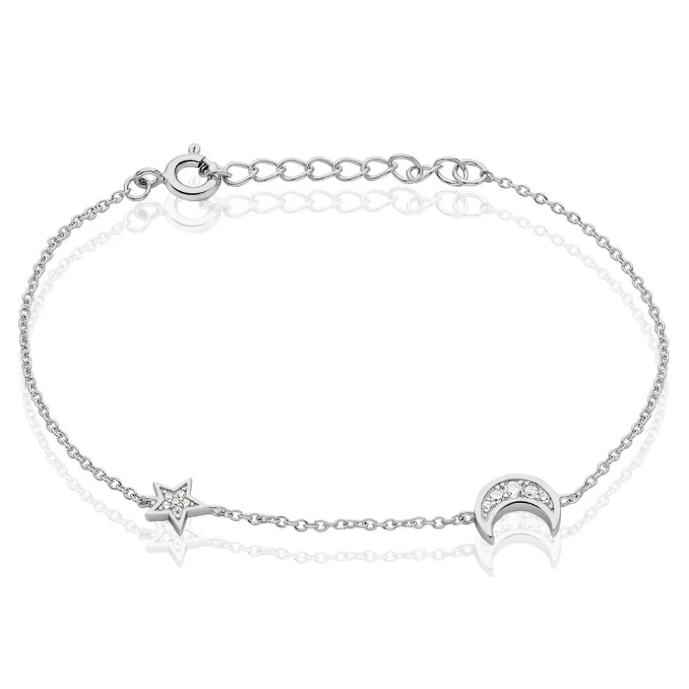 Bracelet Argent 925/1000 theoline Motif Lune Et Etoile Sur Le Cote Pavage Oxydes De Zirconium 18.5cm