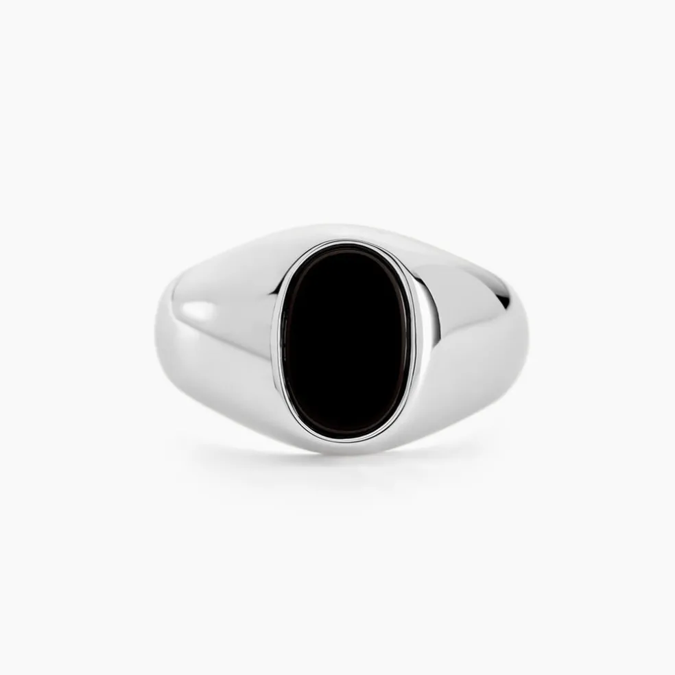 Chevaliere Argent Blanc 925/1000 Plateau Ovale Pierre Noire
