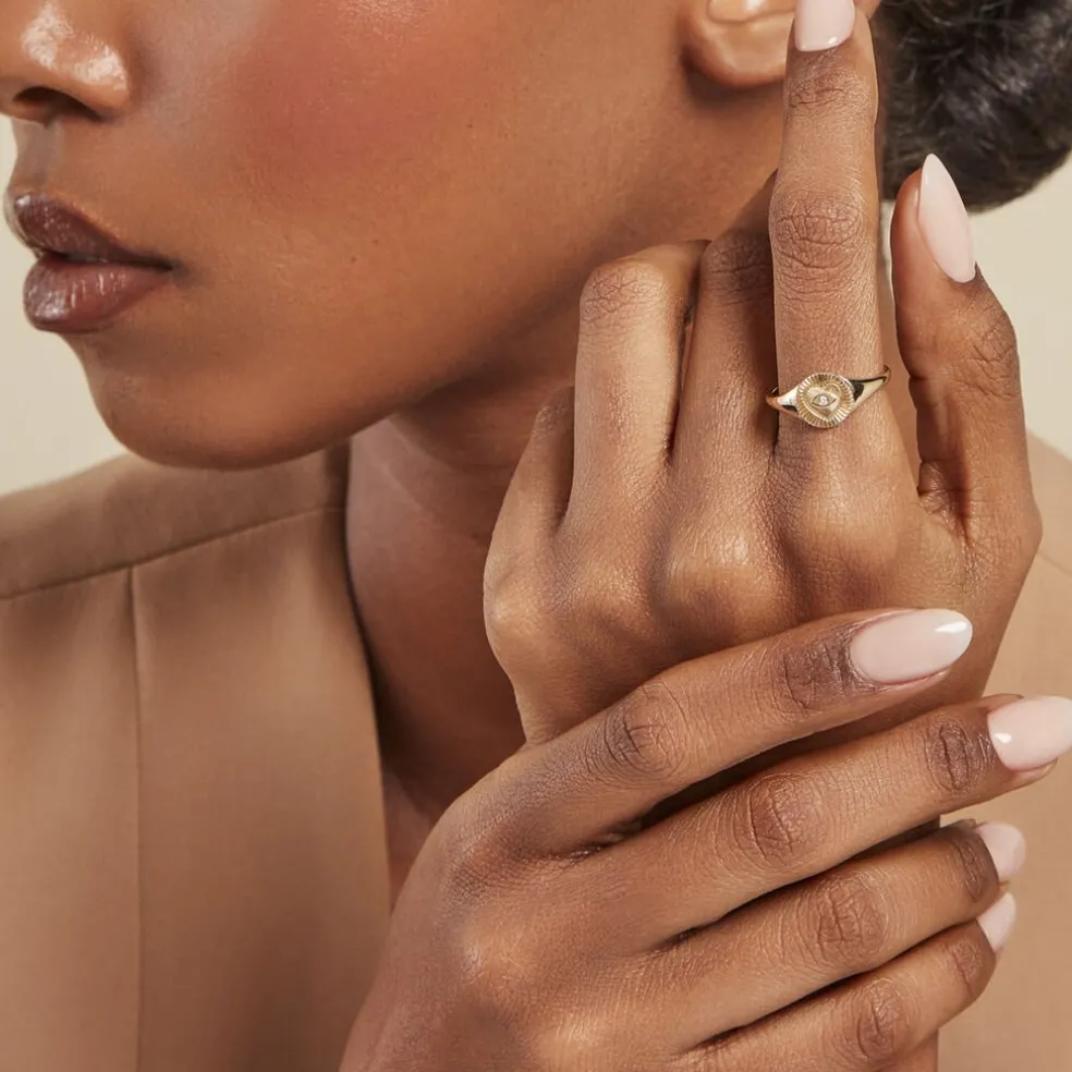Chevaliere Or Jaune 375/1000 Plateau Rond Motif C艙ur 艙il Diamant Serti Clos