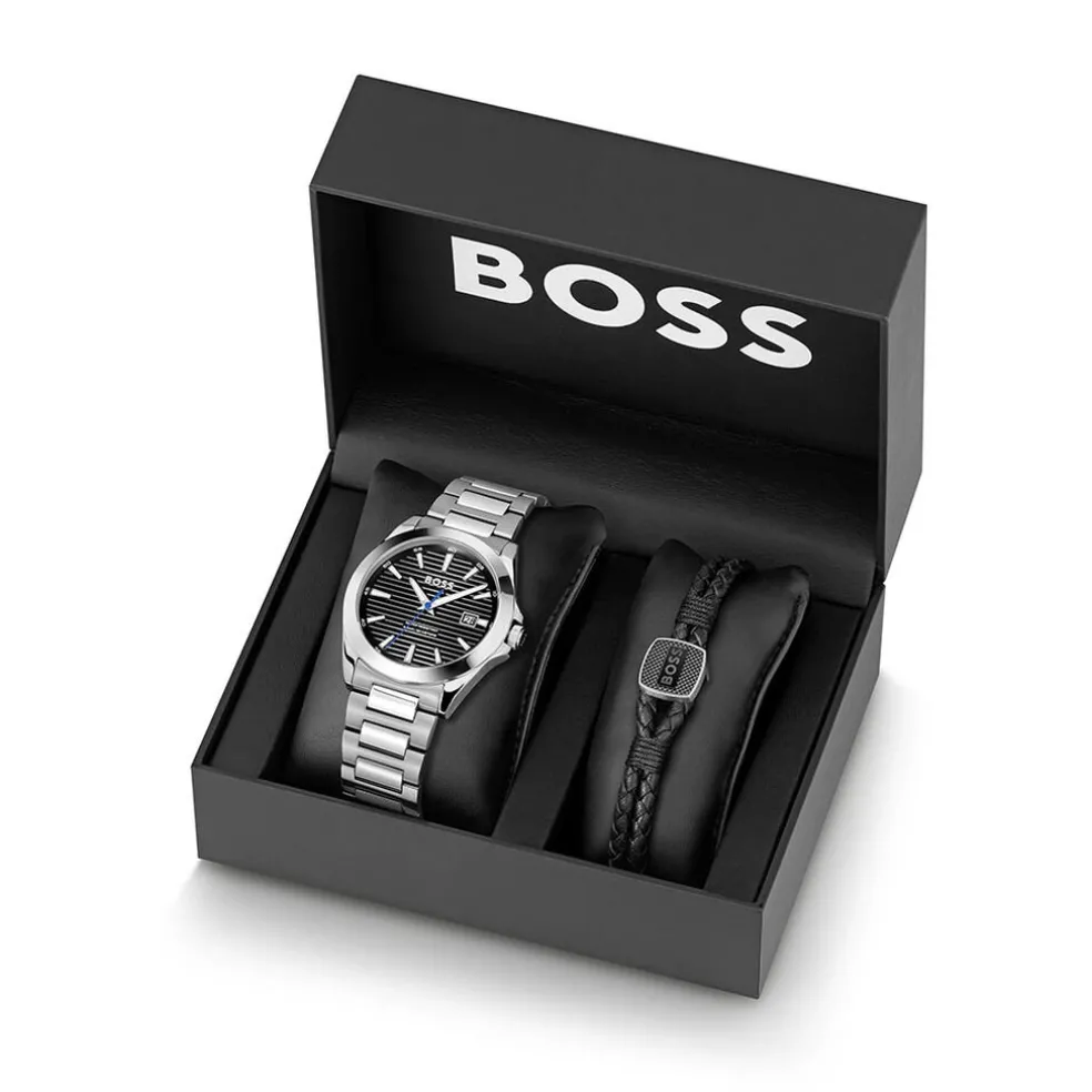 Coffret Montre Boss Strike Acier Inoxydable Argenté Quartz Ronde 41Mm Fond Noir Bracelet Acier Inoxydable Argenté + Bracelet Boss Double Rang Cordon Noir 1570199