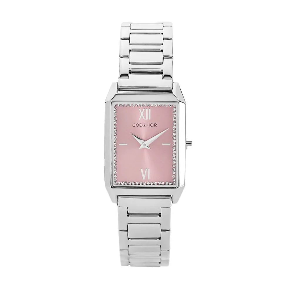 Coffret Montre Codhor Arianne Alliage Argente Rectangulaire Quartz 24x36mm Fond Rose Bracelet Acier Argente Et Bracelet Acier Argente Oxyde De Zirconium Rose 16+3cm P100966-p