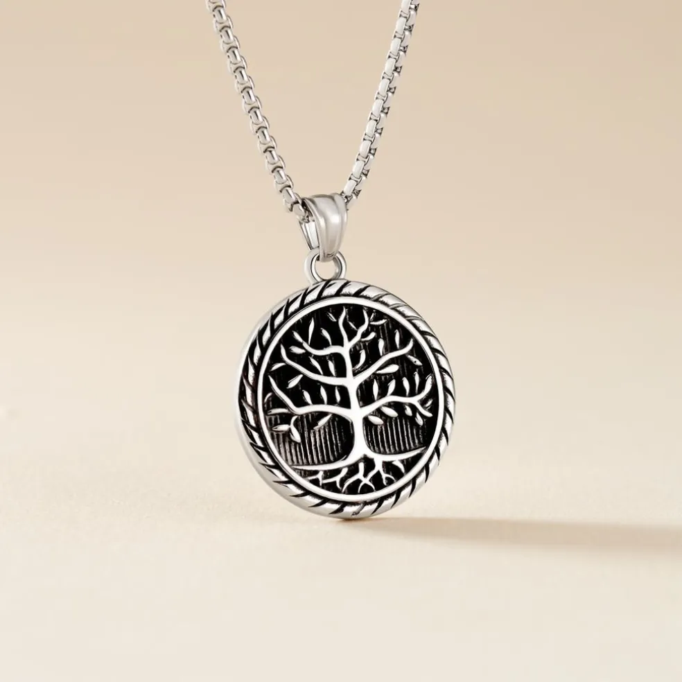 Collier Acier Inoxydable Gris Vieilli Pendentif Arbre De Vie Maille Venitienne 55cm