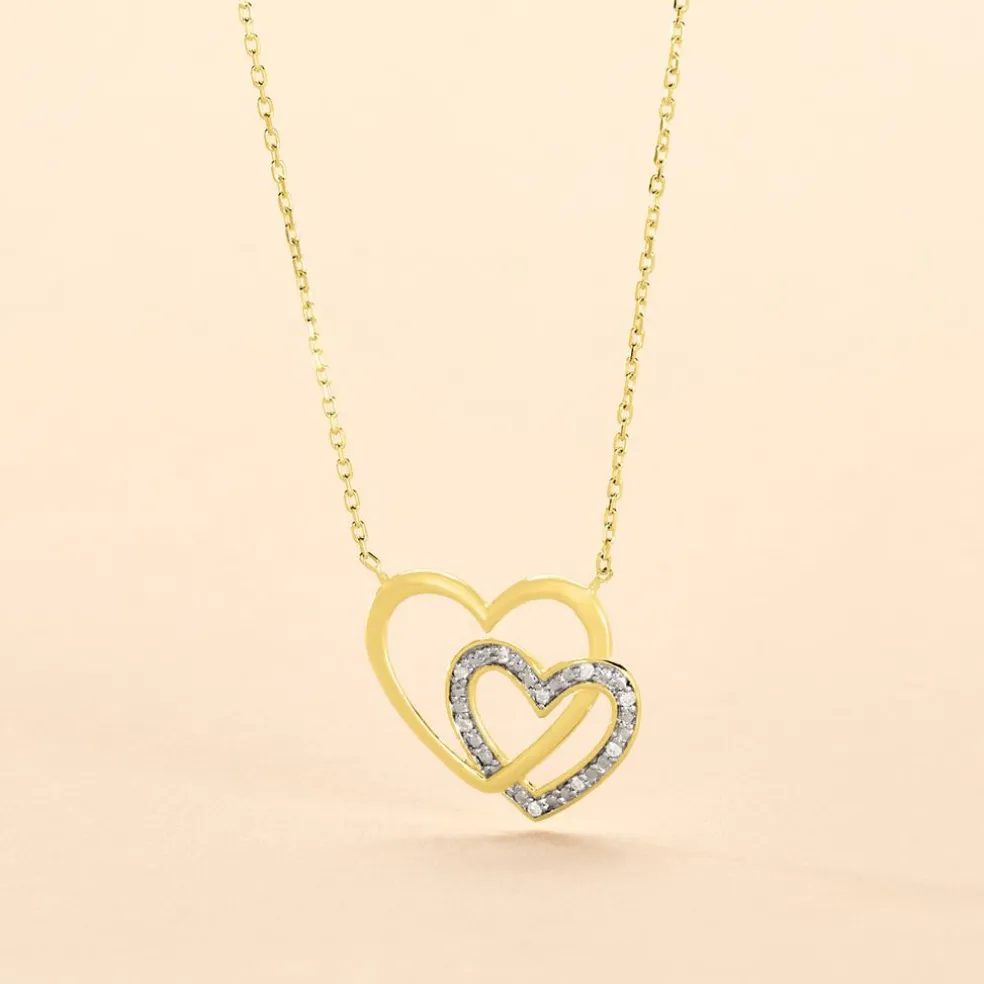 Collier Or Jaune 375/1000 Double C艙ur Pavage Diamants Maille Forcat 40+2cm
