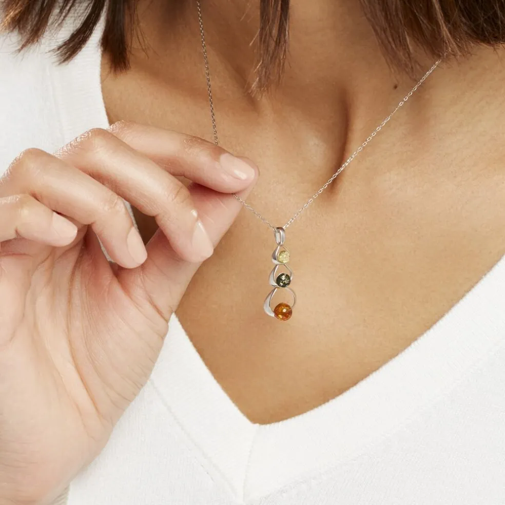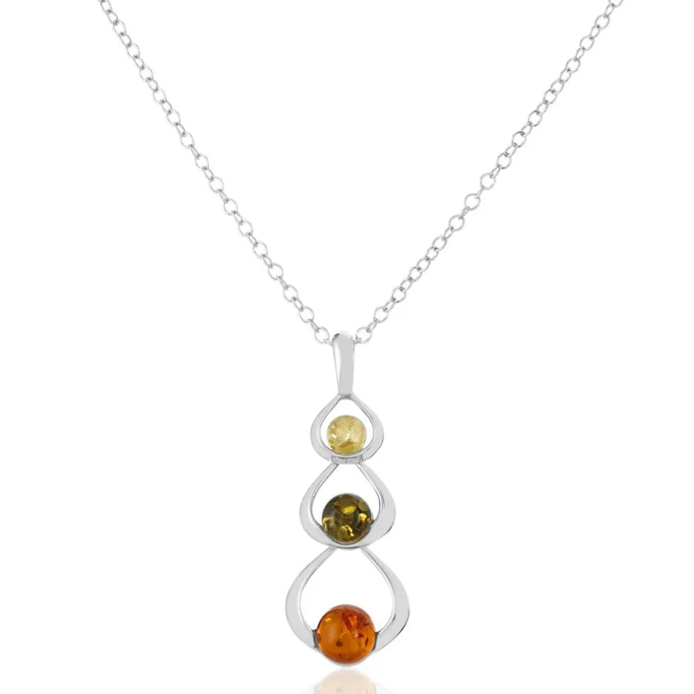 Collier Argent Blanc 925/1000 Trois Cercles Ambres Multicolores Verte/miel/cognac 45cm