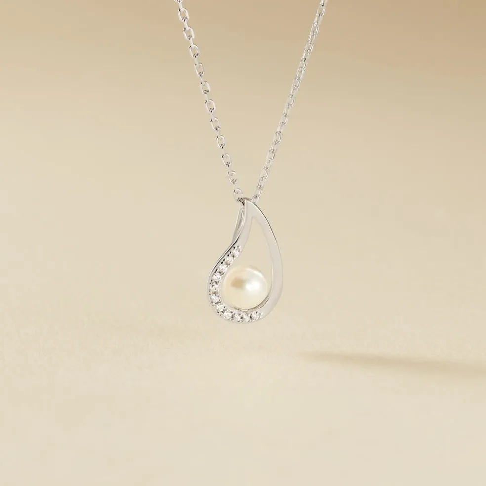Collier Argent Blanc 925/1000 Motif Coquillage Et Perle De Culture Pavage Oxydes De Zirconium 45cm
