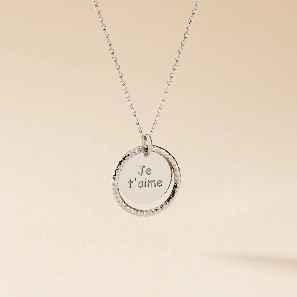 Collier Argent Blanc 925/1000 Pastille Message Je T’aime Entouree Cercle Effet Diamante Maille Forcat 42cm
