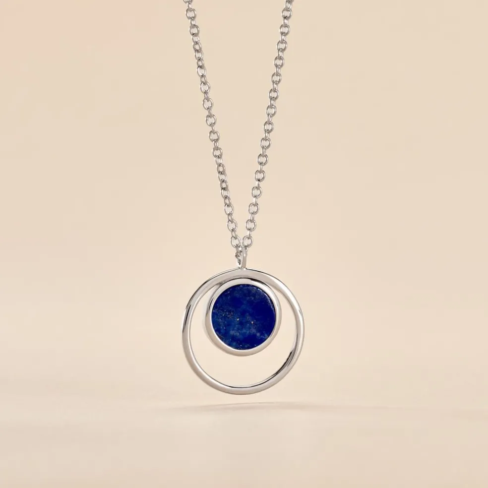 Collier Argent Blanc 925/1000 Double Cercles Lapis Lazuli Maille Forcat 45cm