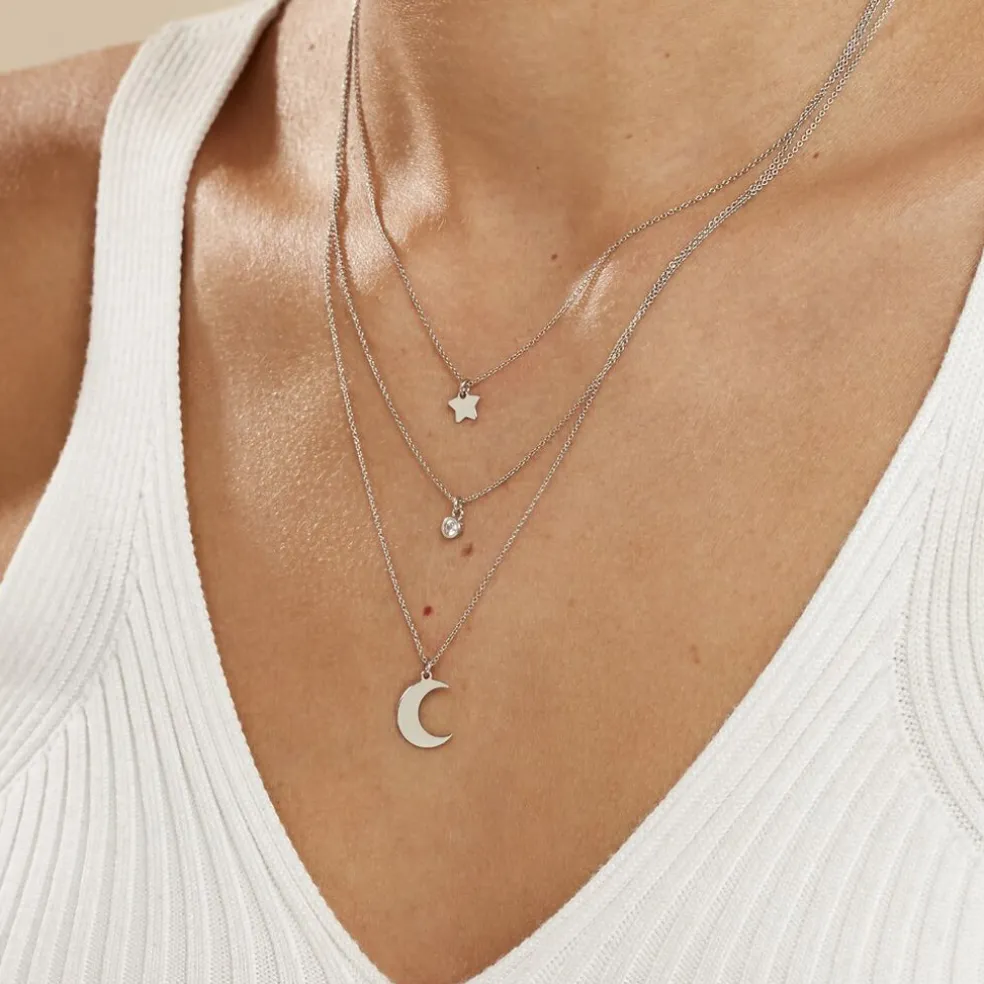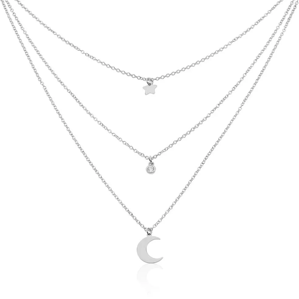 Collier Argent Blanc 925/1000 Lune. Etoile Et Oxyde De Zirconium Triple Mailles Forcat 41cm