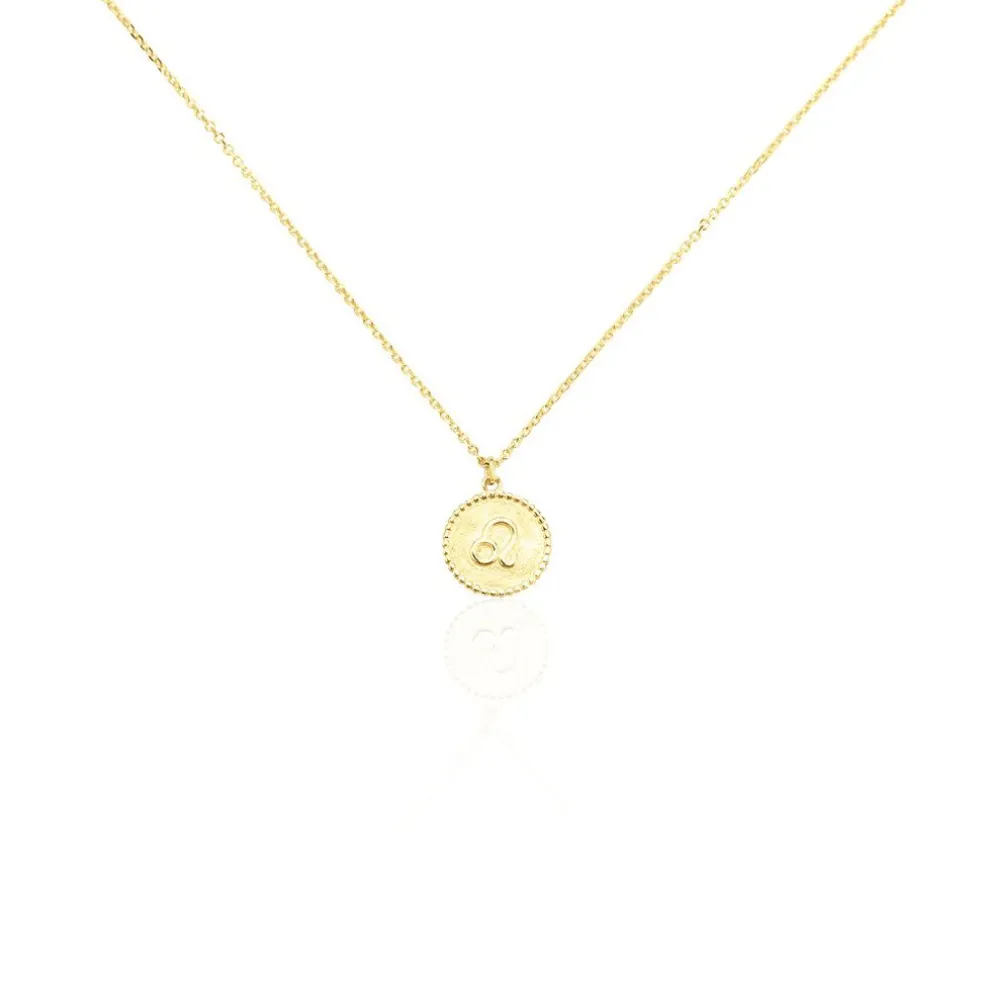 Collier Or Jaune 375/1000 Pastille Zodiaque Lion Brosse Effet Perlee Maille Jaseron 40+2cm