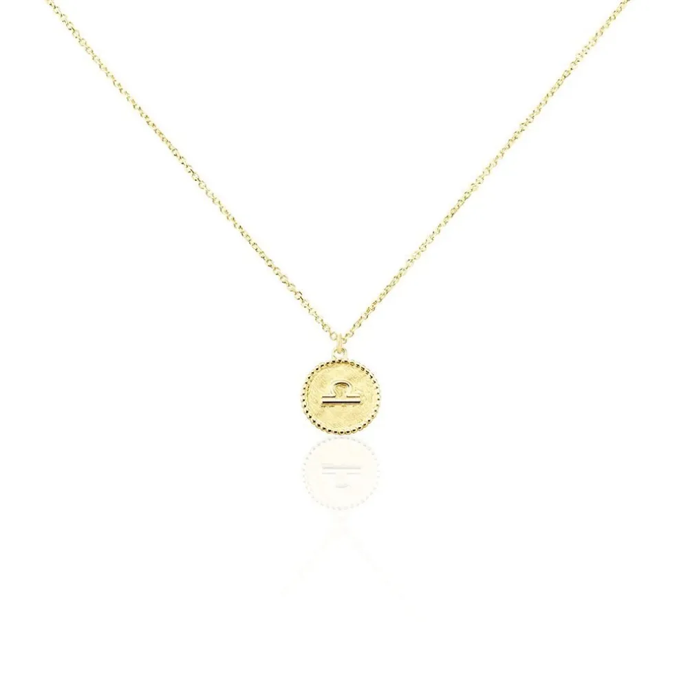 Collier Or Jaune 375/1000 Pastille Zodiaque Balance Brosse Effet Perlee Maille Jaseron 40+2cm