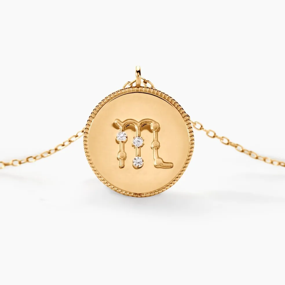 Collier Or Jaune 375/1000 Pastille Zodiaque Scorpion Diamant Maille Forcat 40+2cm