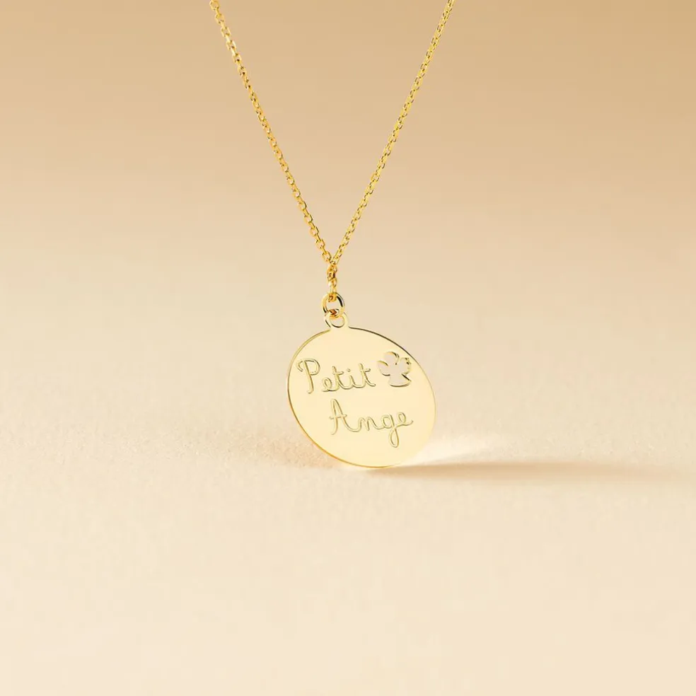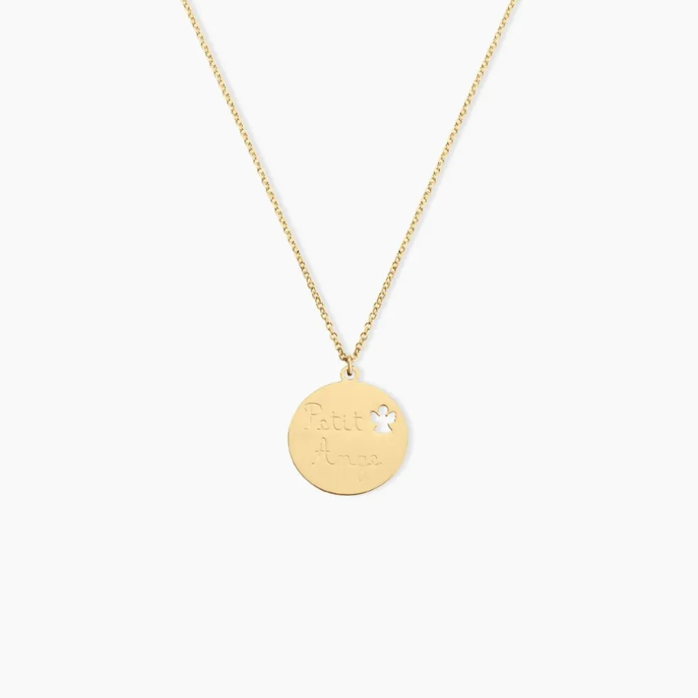 Collier Or Jaune 375/1000 Pastille Message Petit Ange Maille Jaseron 38cm