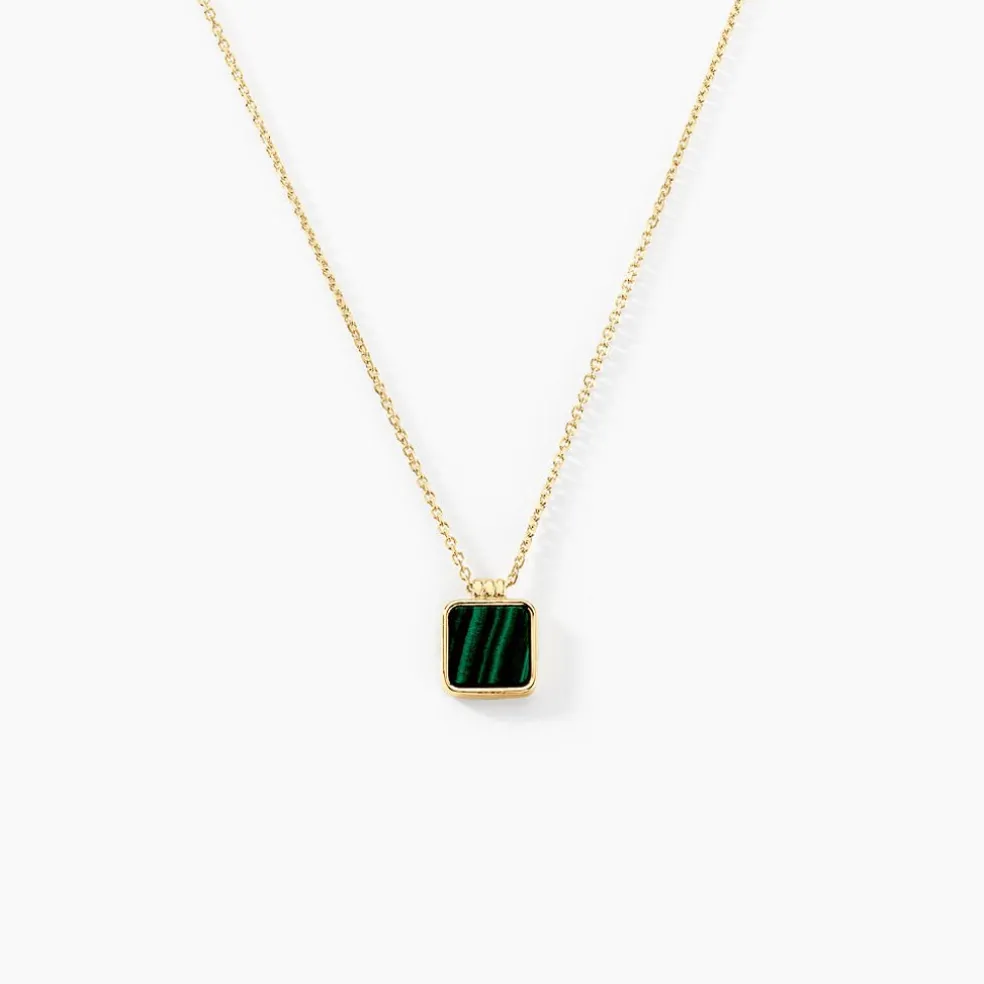 Collier Or Jaune 375/1000 Carre Malachite Verte Serti Clos Maille Jaseron 40+2cm