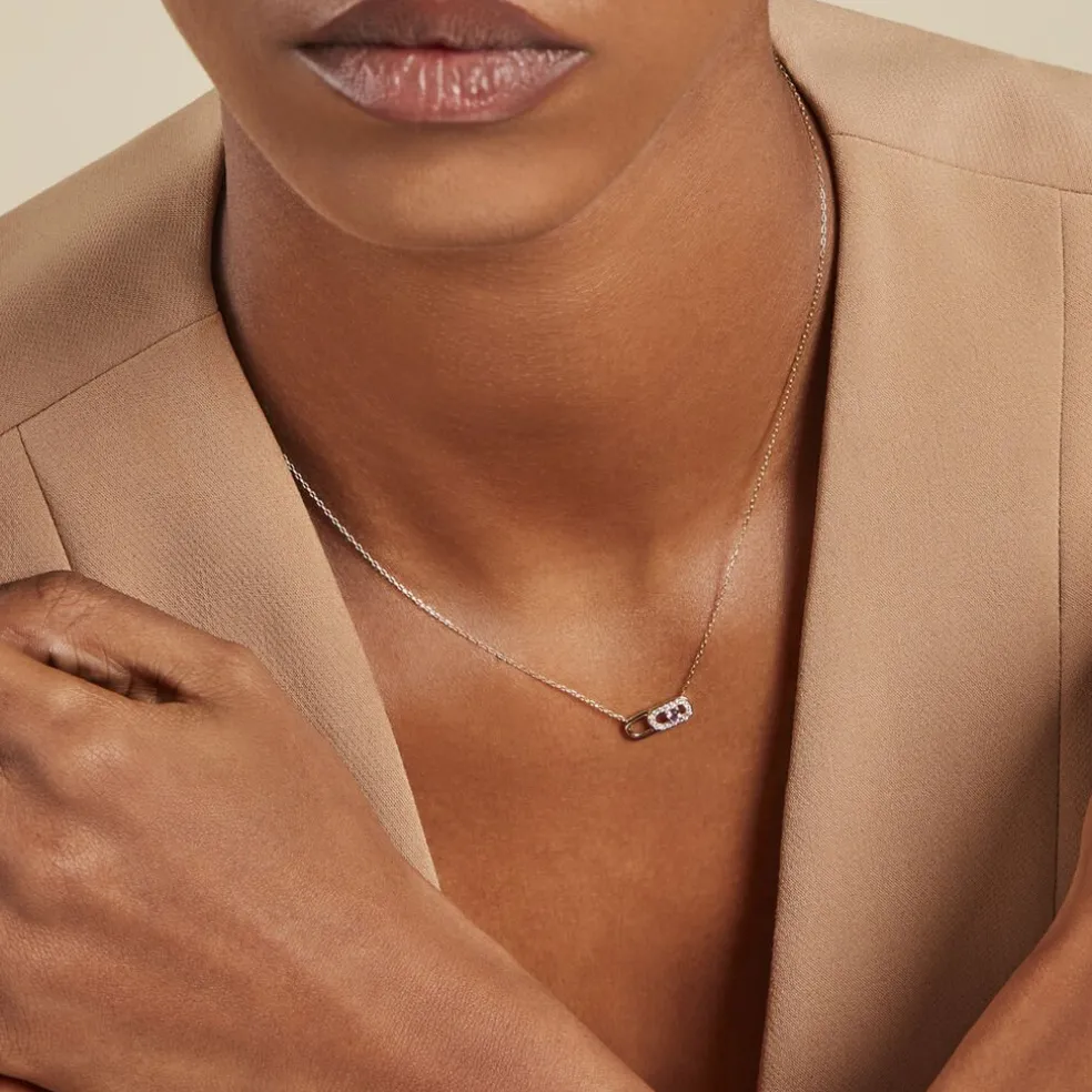 Collier Or Jaune 375/1000 1 Amethyste Ronde Sertis Griffes Motif Maillons Ovale Oxyde De Zirconium Maille Forcat 40+2cm