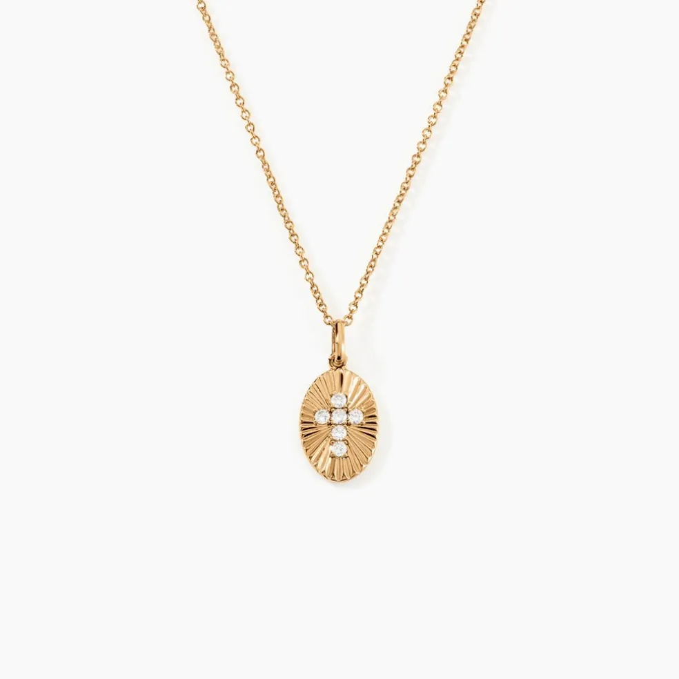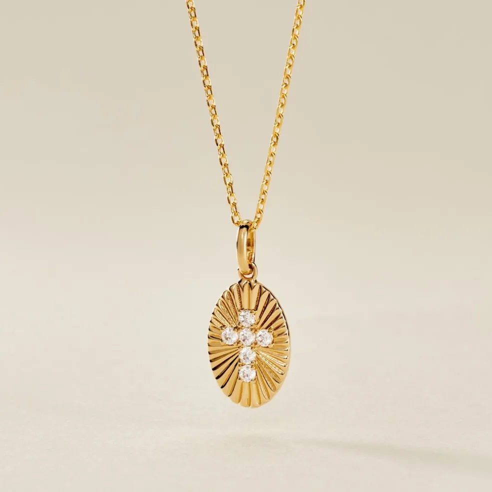 Collier Plaque Or Ovale Strié Motif Croix Pavage Oxydes De Zirconium Maille Forcat 42+3cm