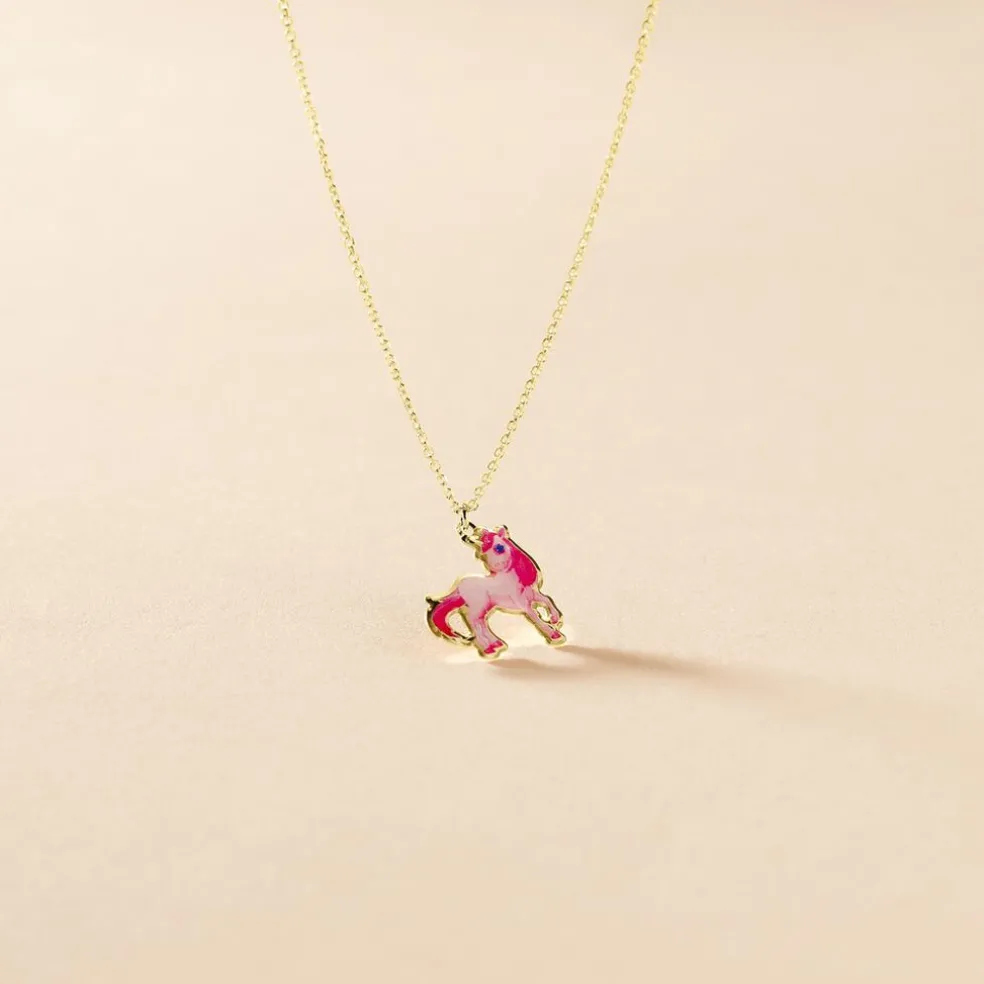 Collier Or Jaune 375/1000 Motif Poney Smalto Rose Maille Jaseron 38cm