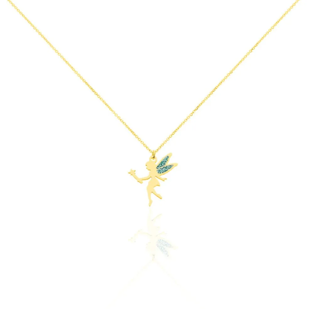 Collier Or Jaune 375/1000 Motif Fee Glitter Bleu Maille Jaseron 38cm