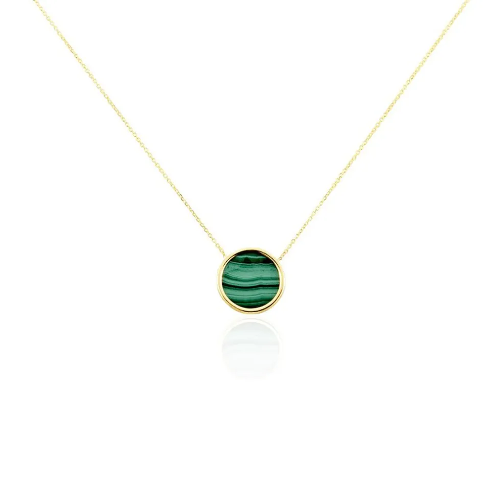 Collier Or Jaune 375/1000 Pastille Malachite Verte Serti Clos 10mm Maille Jaseron 42+3cm