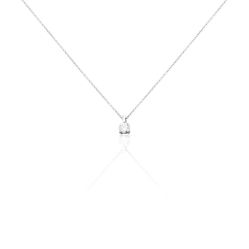 Collier Or Blanc 750/1000 Maille Jaseron + Pendentif Diamants 0.26cts 4 Griffes Beliere Fixe 42cm