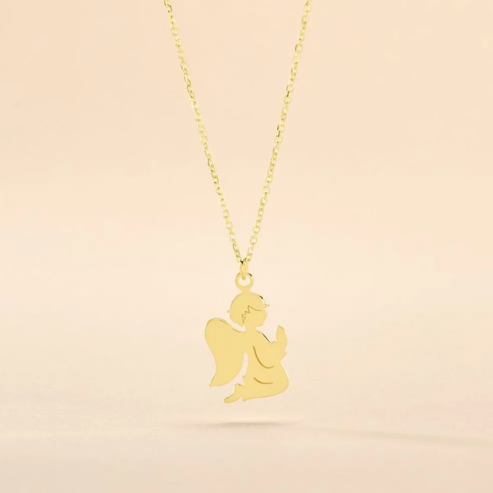 Collier Or Jaune 375/1000 Motif Ange Qui Prie Maille Jaseron 38cm