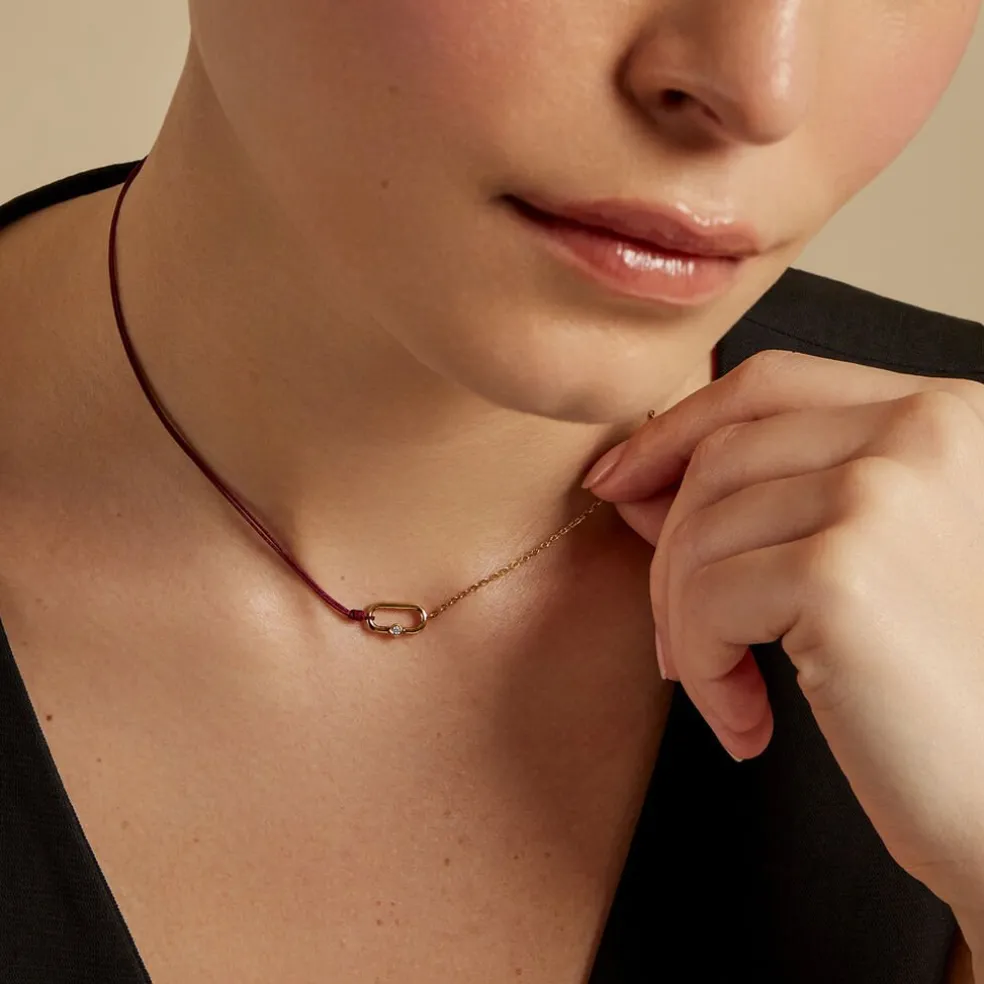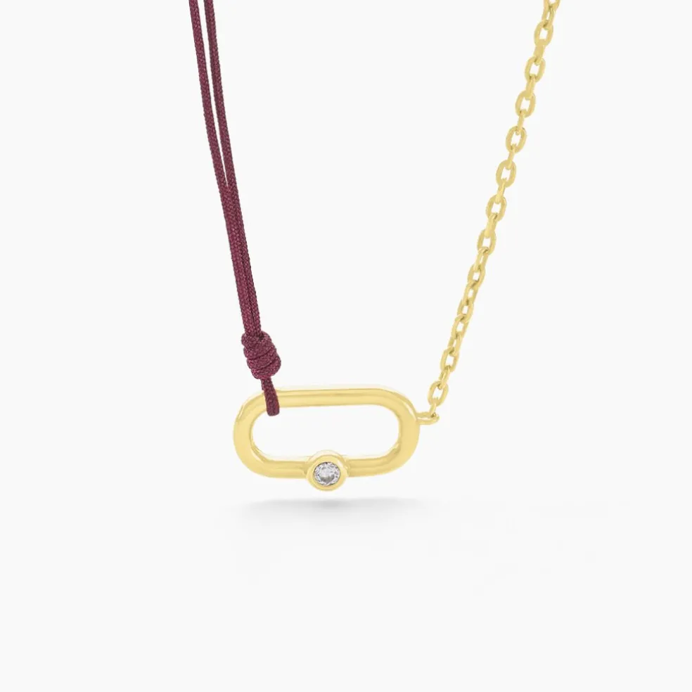 Collier Argent Jaune 925/1000 Maillon Ovale Oxyde De Zirconium Serti Clos Cordon Rouge Et Maille Jaseron 36+3cm
