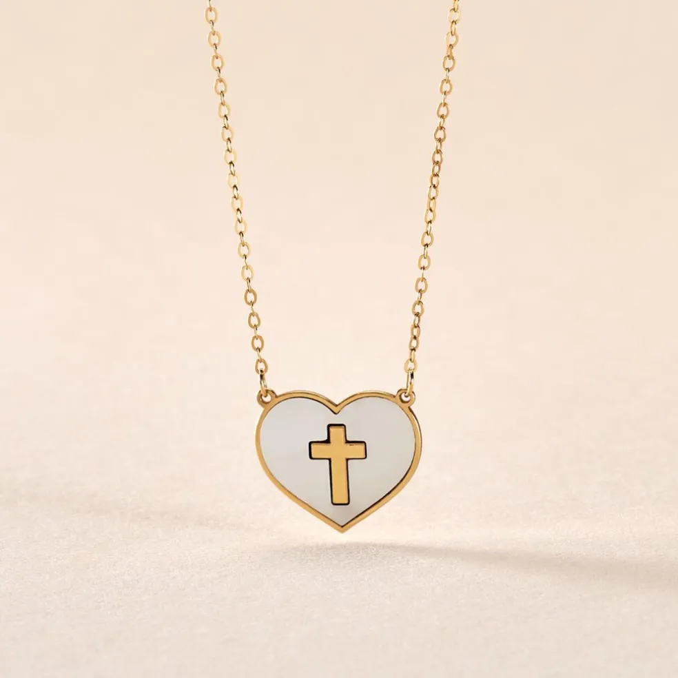 Collier Or Jaune 375/1000 C艙ur Nacre Blanche Avec Croix Maille Forcat 40+2cm