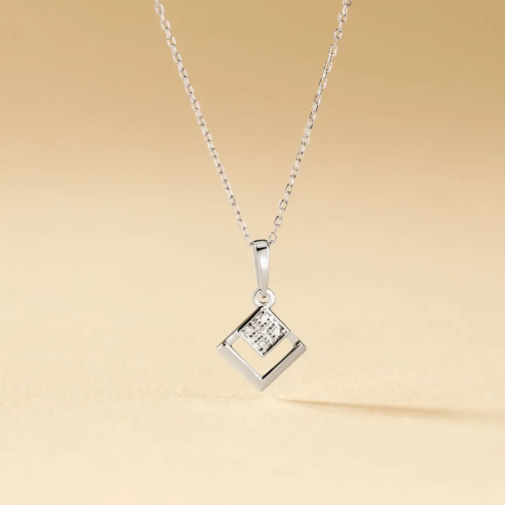 Collier Or Blanc 375/1000 Forme Losange Ajoure + Semi Pavage Diamants 42cm