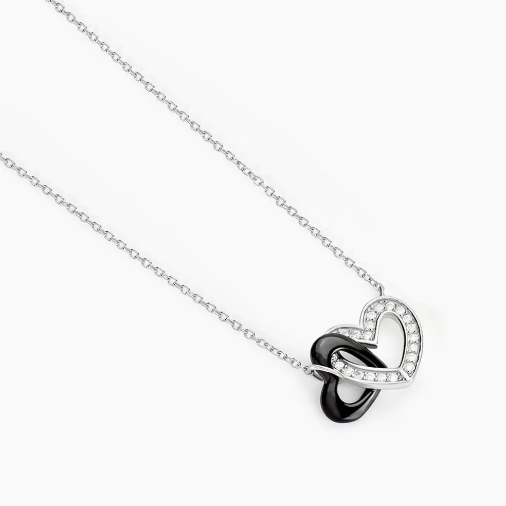 Collier Argent Blanc 925/1000 Double Coeur Céramique Noire Et Oxydes De Zirconium Maille Forçat 42+3cm