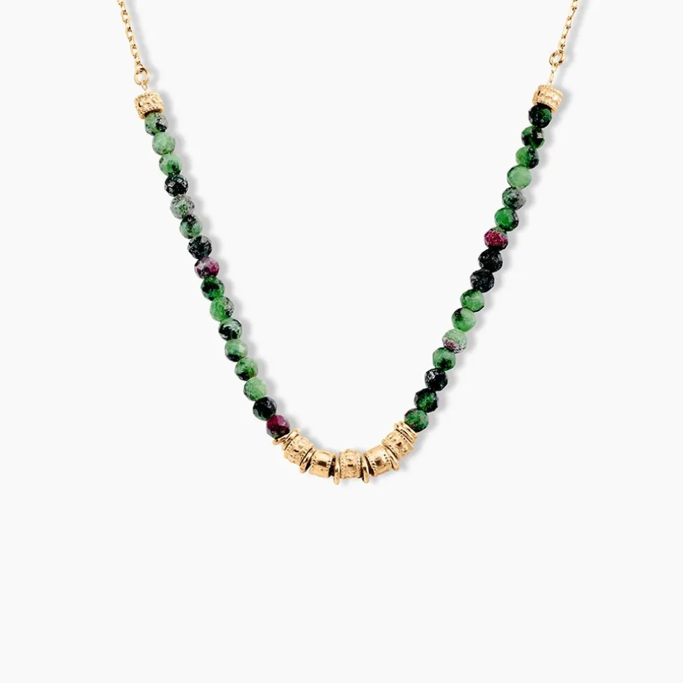 Collier Plaqué Or Jaune Perles Ethniques Et Rubis Zoisites Verts Violets Maille Forçat 40+5cm