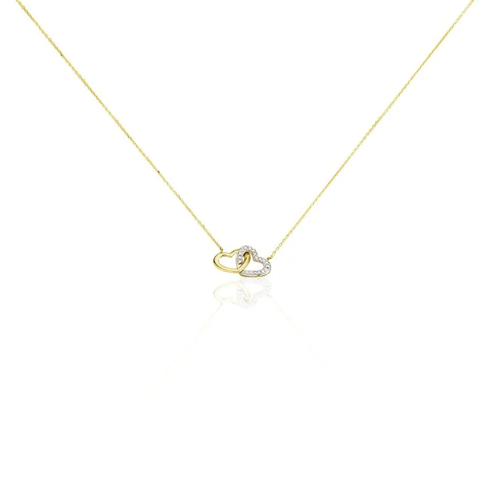 Collier Or Jaune 375/1000 Forme Double C艙ur Pavage Diamants Maille Forçat 42cm