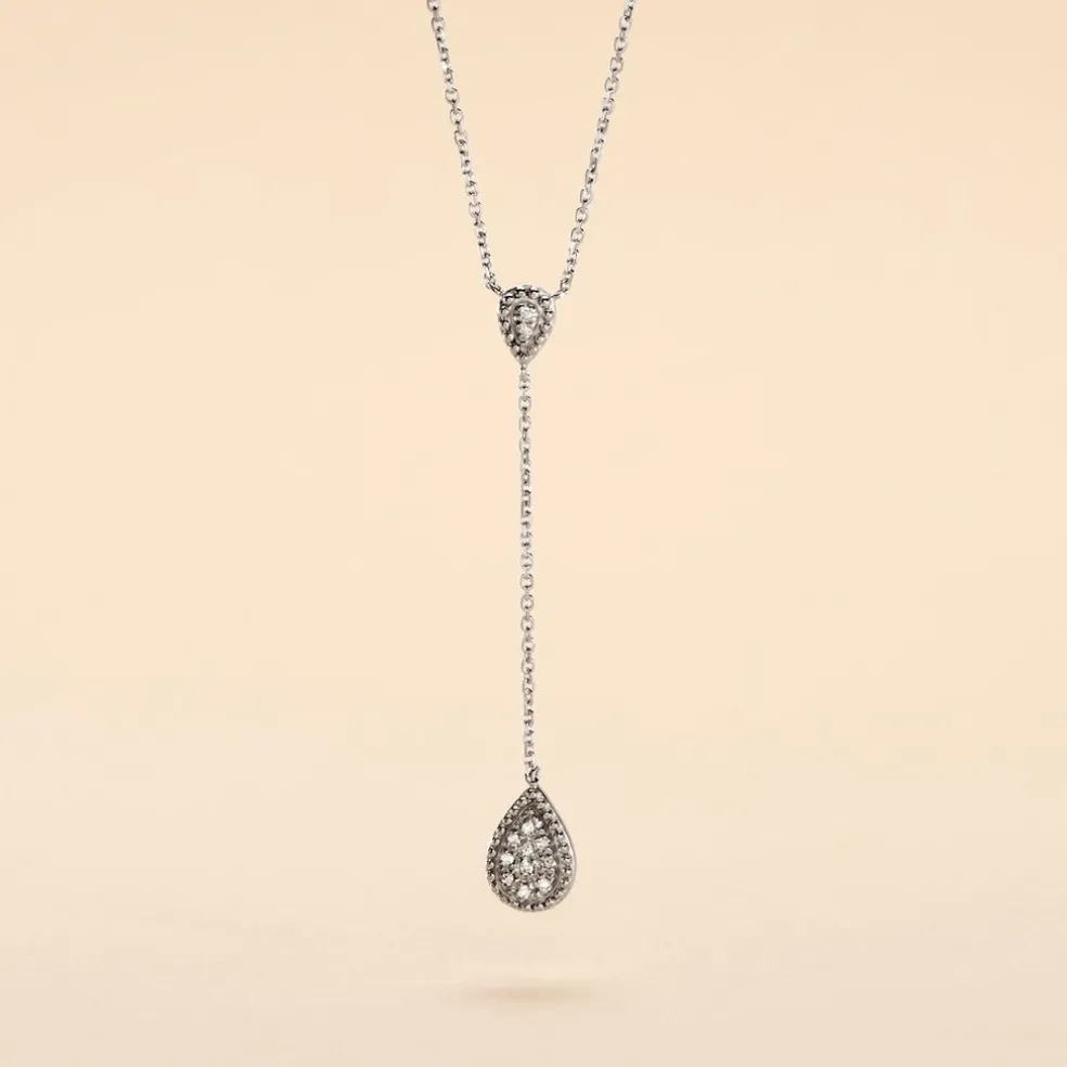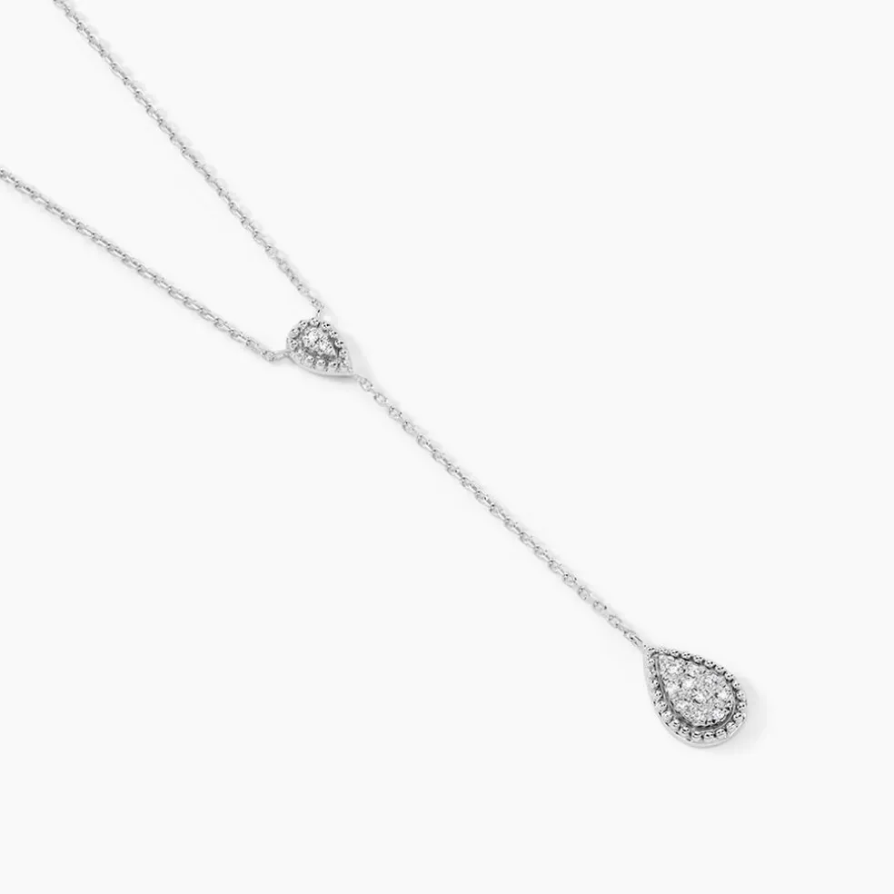 Collier Or Blanc 375/1000 Cravate Forme Goutte Pavage Diamants 42cm