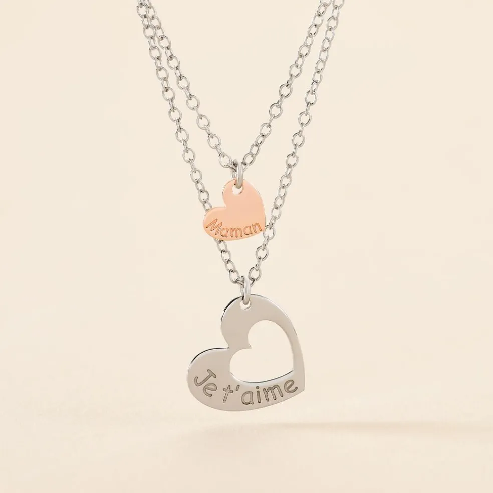Collier Argent Bicolore 925/1000 Double Chaines Pampilles C艙ur Ecriture Maman + C艙ur Ajoure Ecriture Je T’aime 42cm