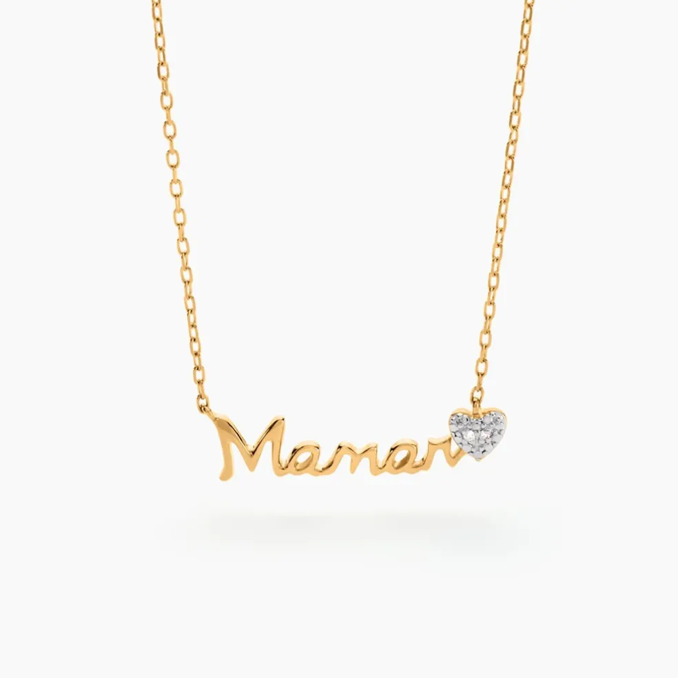 Collier Or Jaune 375/1000 Message Maman C艙ur Pavage Diamant Maille Forcat 40+2cm