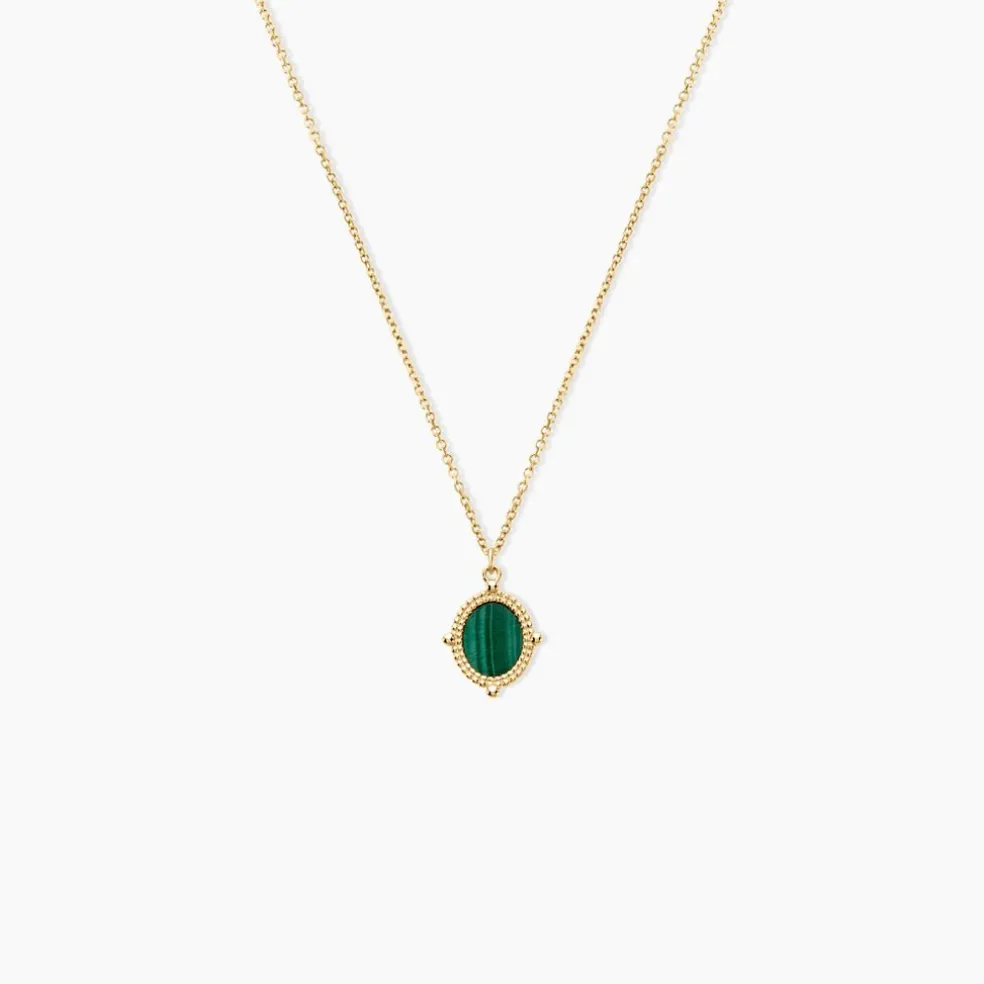 Collier Or Jaune 375/1000 Malachite Ovale Effet Perle Maille Jaseron 40+2cm