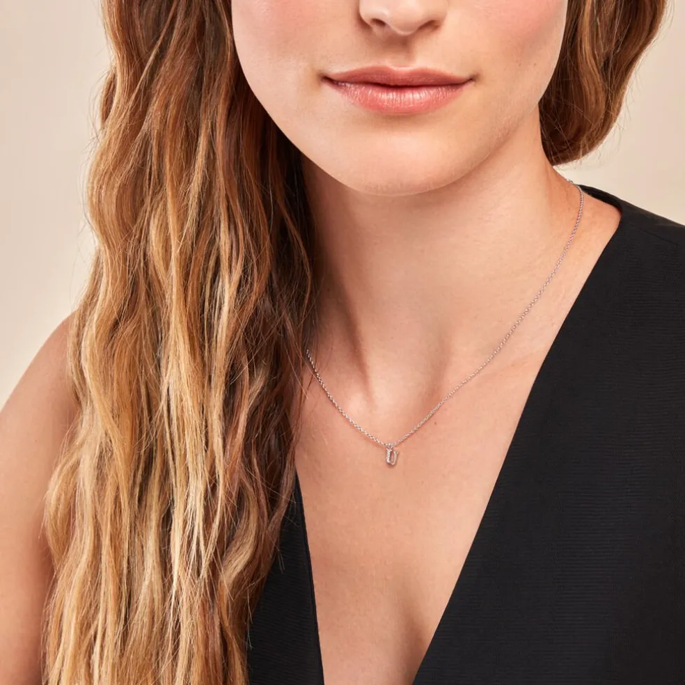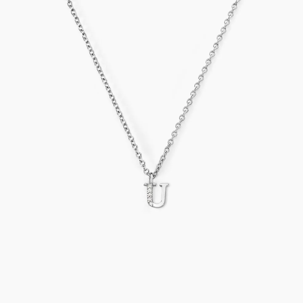 Collier Argent Blanc 925/1000 Lettre U Semi Pavage Oxydes De Zirconium Maille Forçat 38+3cm