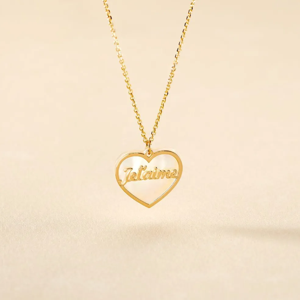 Collier Or Jaune 375/1000 C艙ur Nacre Et C艙ur Ajoure Message Je T’aime Maille Jaseron 40+2cm