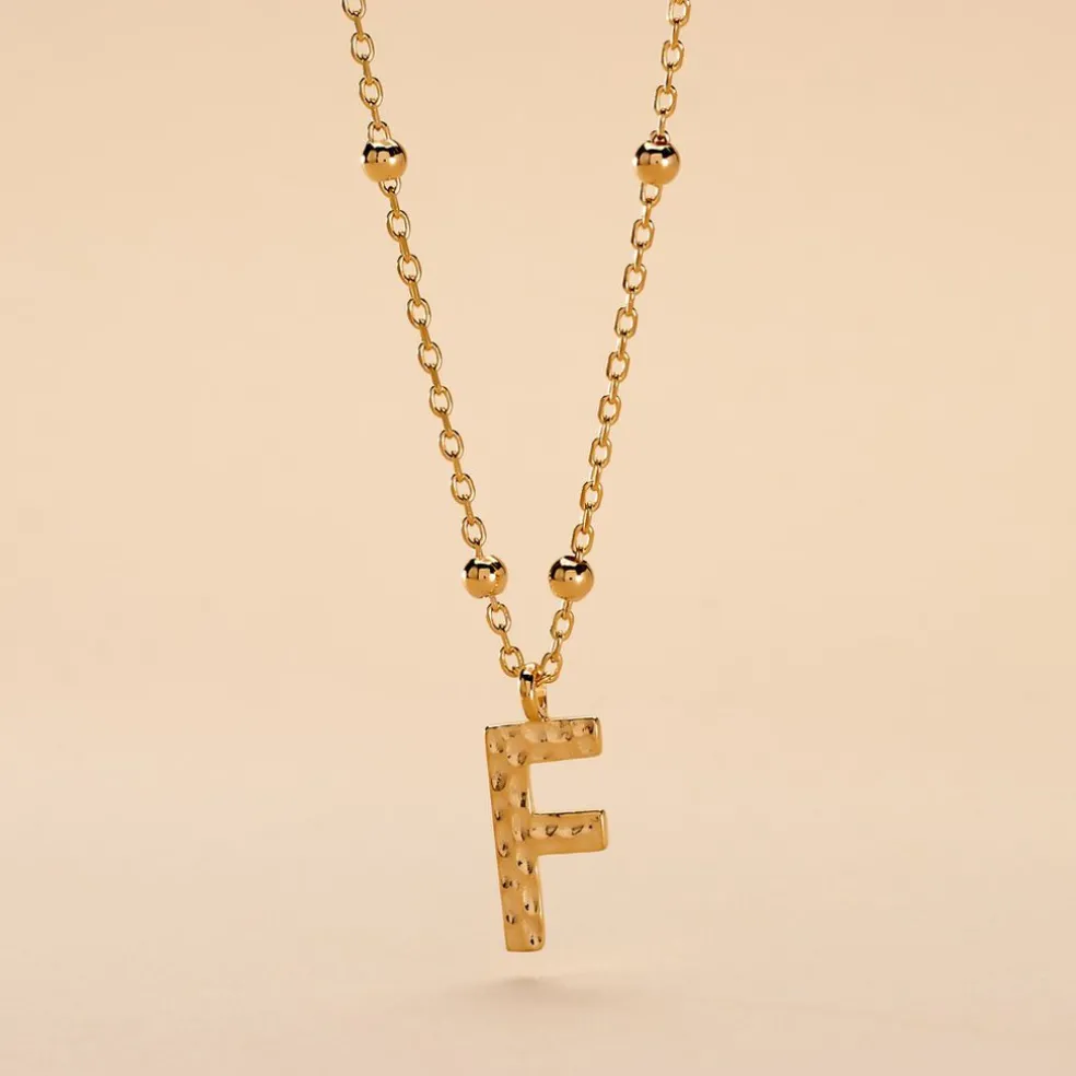 Collier Plaque Or Jaune Lettre F Martelee Et Petites Boules Chaine Maille Forcat Longueur 45cm