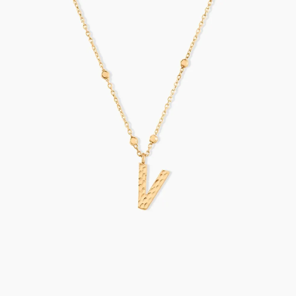 Collier Plaque Or Jaune Lettre V Martelee Et Petites Boules Chaine Maille Forcat Longueur 45cm