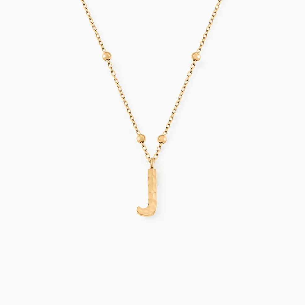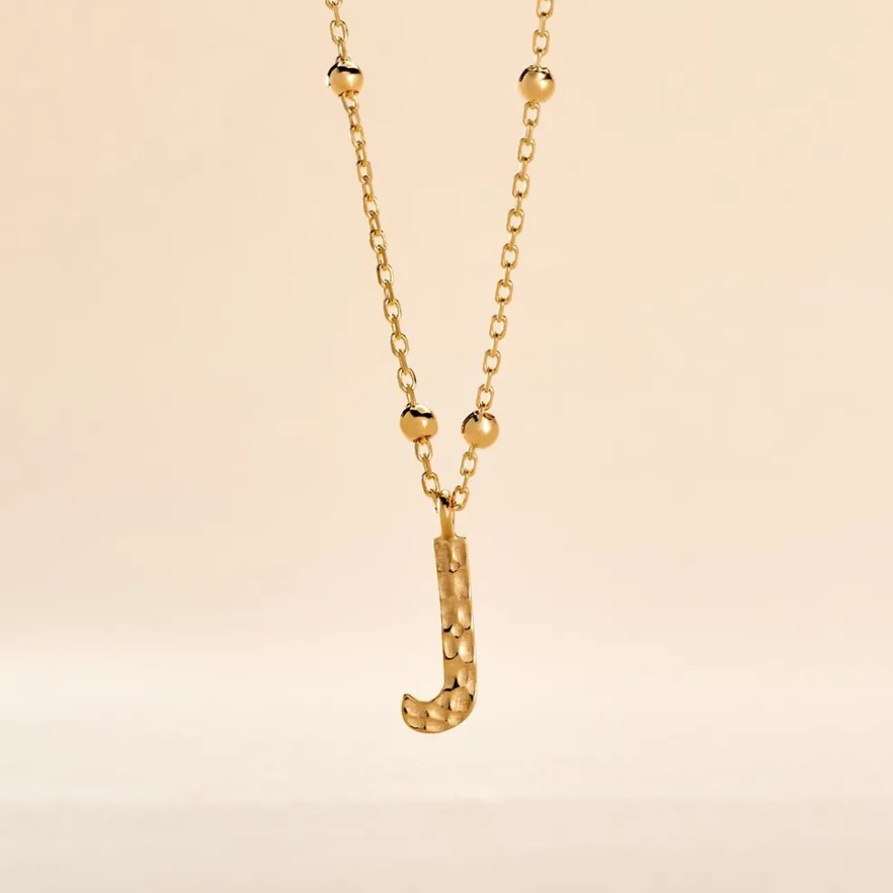 Collier Plaque Or Jaune Lettre J Martelee Et Petites Boules Chaine Maille Forcat Longueur 45cm