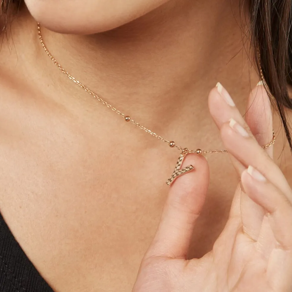 Collier Plaque Or Jaune Lettre Y Martelee Et Petites Boules Chaine Maille Forcat Longueur 45cm