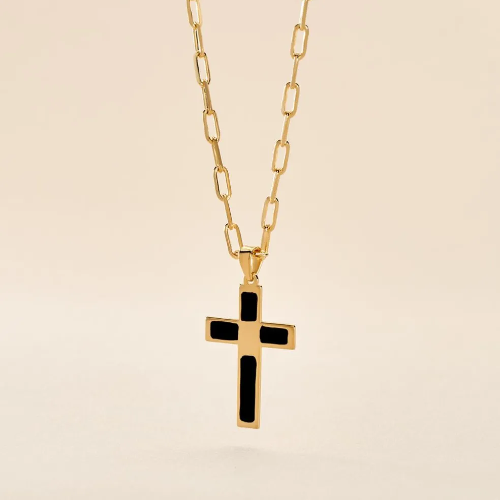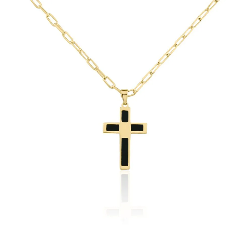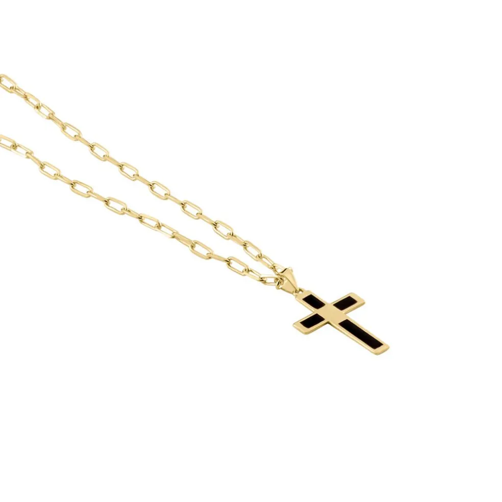Collier Plaqué Or Jaune Croix Email Noir Maille Cheval 55cm