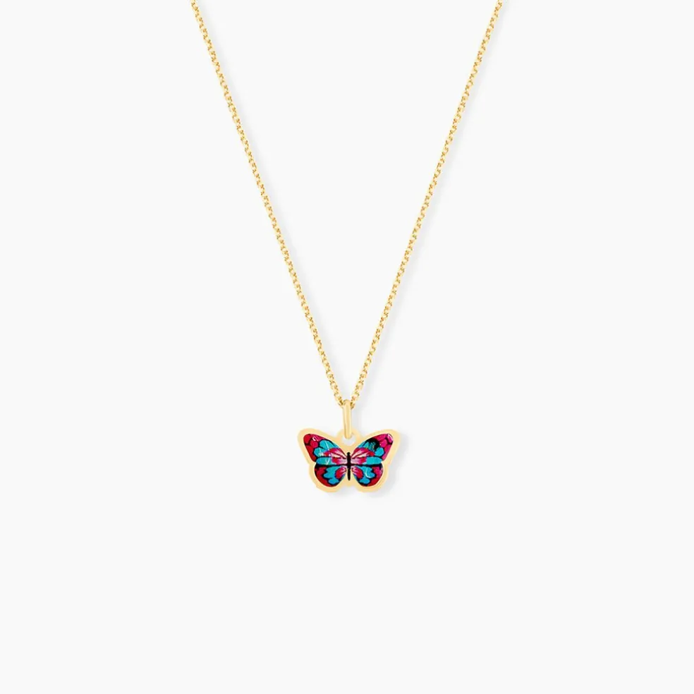 Collier Or Jaune 375/1000 Papillon Fushia Et Bleu Maille Jaseron 38cm